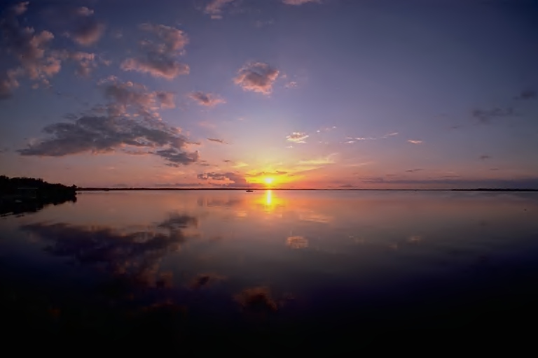 The colours began to change as the fiery crimson disc slowly rose into the sky. A vivid pink and orange radiated out from the sun, and yet, far from the centre of the sunrise, the sky remained a deep midnight blue. As it slowly climbed upwards, sunbeams shot their fingers of light in all directions, turning the upper atmosphere into a cool shade of blue.